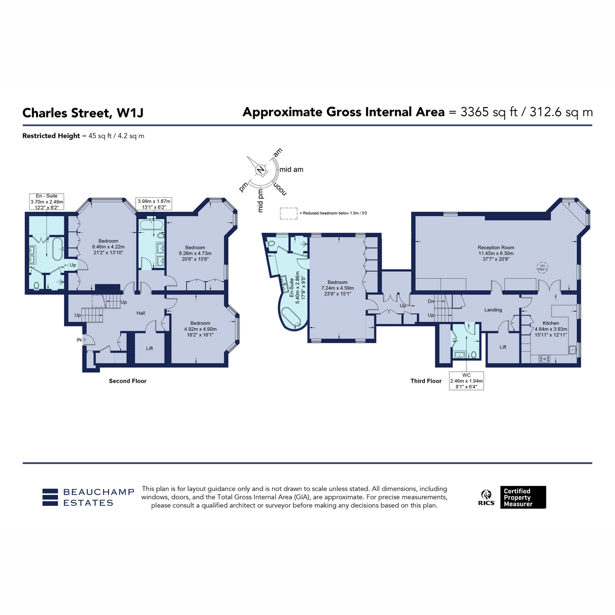 This substantial apartment is arranged across the second and third floors, offering over 3,300 sq ft of internal accommodation with lift access. The second floor is predominantly dedicated to bedroom accommodation, comprising multiple large bedrooms with en suite bathrooms and a central hall. The third floor provides a generous reception room, a separate kitchen and an additional bedroom suite, creating a clear division between living and sleeping areas. The layout delivers scale, privacy and practicality, well suited to prime central London living.