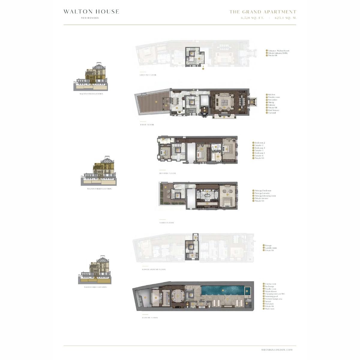 With a private ground floor lobby and its own exclusive 6-person lift connecting all floors, the property features stunning architecture, an ambassadorial reception room with a ceiling height in excess of 4m, four elegant bedroom suites, a beautiful rooftop terrace and air conditioning throughout. The exclusive leisure floor includes a 13-metre swimming pool, cinema room and bar-lounge area.