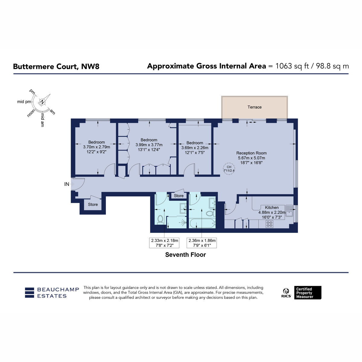 A bright and spacious three-bedroom, two-bathroom apartment (1,064 sq ft / 98 sq m) located on the seventh floor of a portered development in the heart of St John’s Wood.