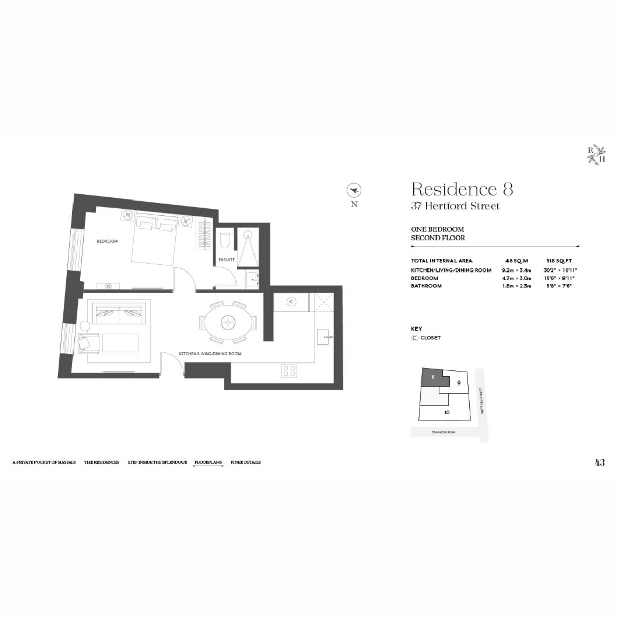 Set within restored Georgian buildings on Hertford Street in the Shepherd Market enclave, the development remains small in scale and is supported by dedicated concierge and security services, serviced by the adjacent hotel. Residents also have access to hotel-linked amenities including a café, cocktail bar and restaurant.
