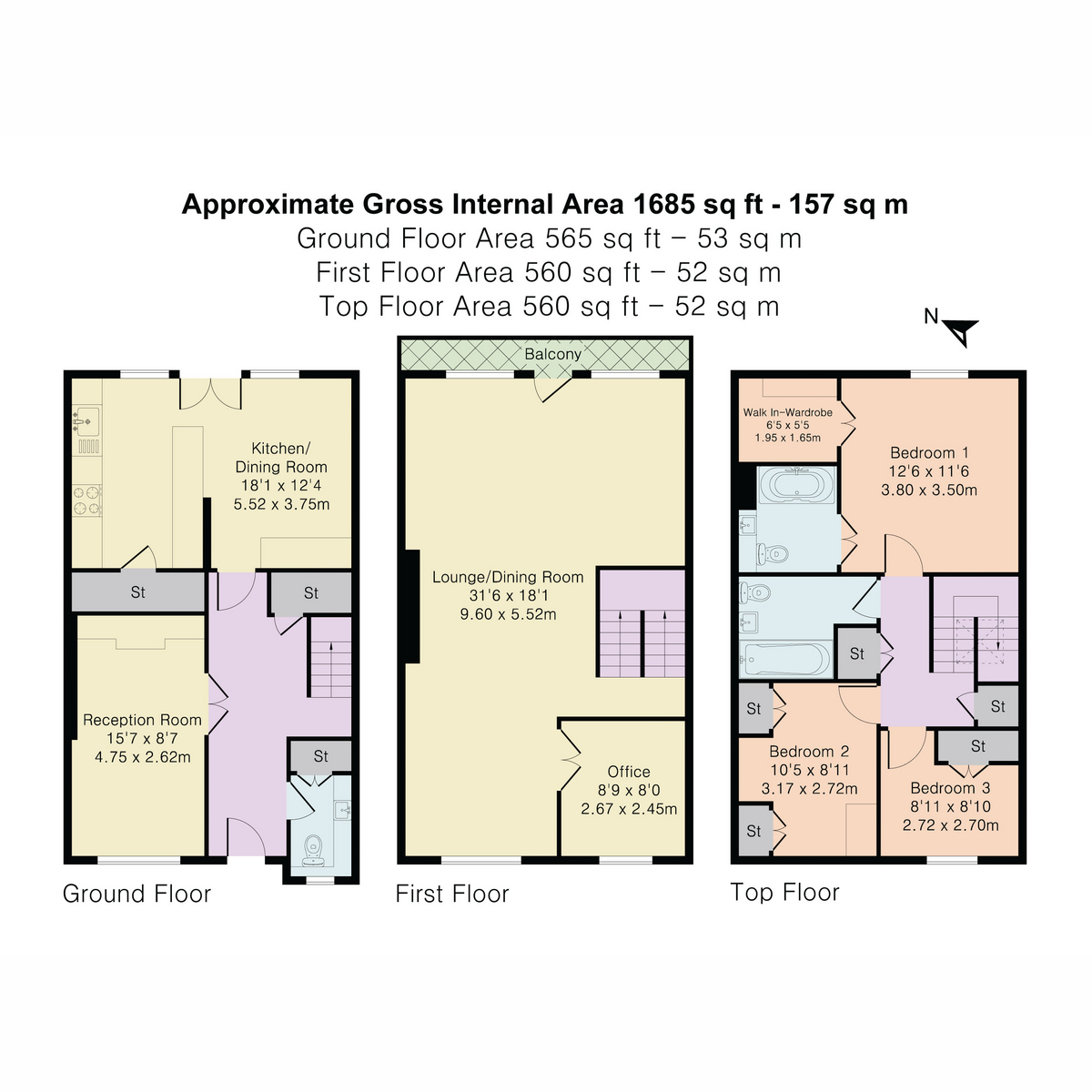 Arranged over three floors, the accommodation is well considered and balanced. The first floor is dedicated to a full-width reception room with wood flooring, creating a defined entertaining space. The ground floor comprises an open plan kitchen and dining room, forming the core of everyday living, alongside a separate office and additional reception space. The upper floor provides a principal bedroom suite with ensuite and walk-in wardrobe, complemented by further bedrooms and a family bathroom, offering a layout suited to both family use and guests.