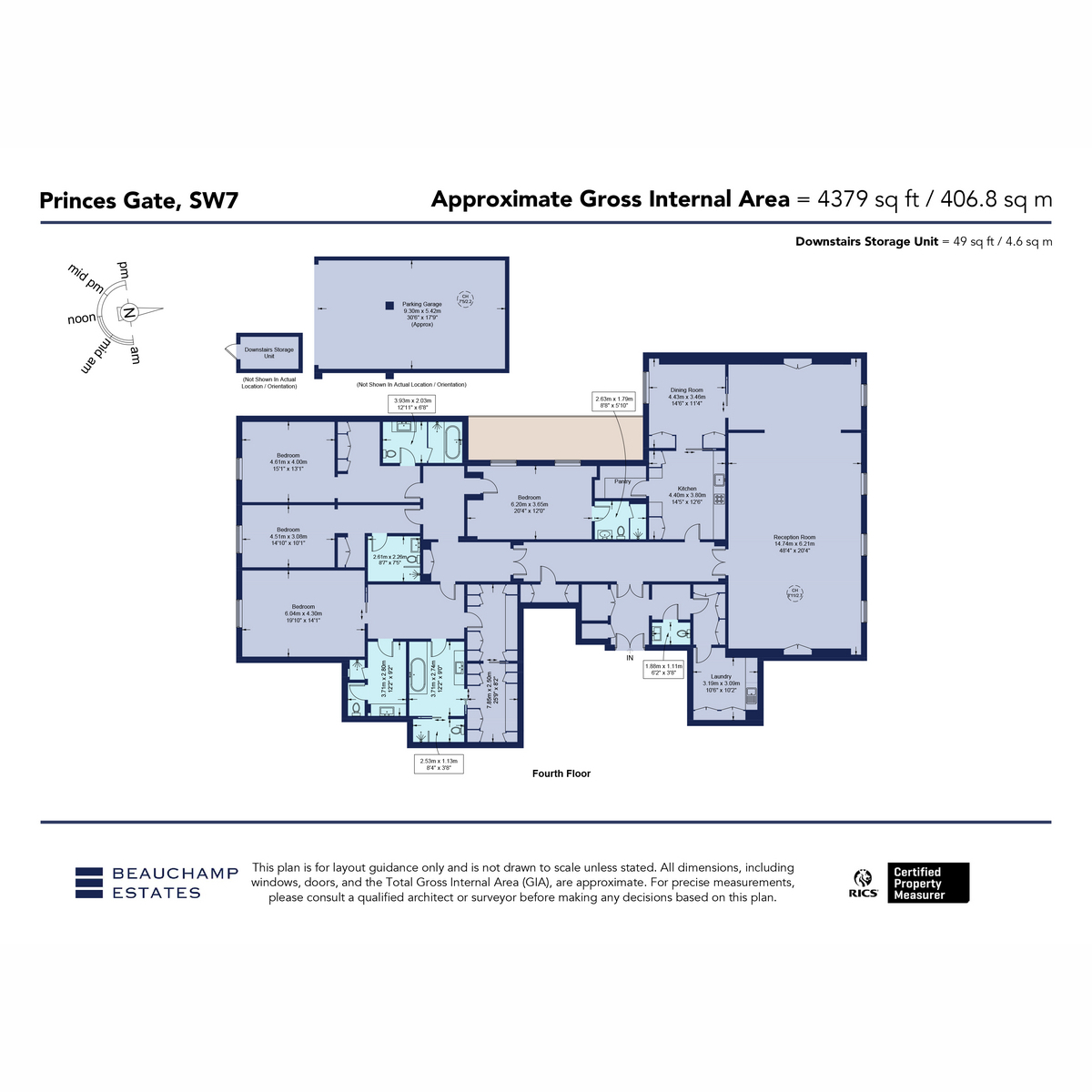 The bedroom accommodation is arranged along a wide internal corridor, with the principal suite offering two dressing rooms plus a large ensuite with separate shower. Three further double bedrooms each have their own ensuite and sit to the rear overlooking the private gardens. A laundry room, guest WC, ample storage, a separate downstairs storage unit and two private parking spaces complete the apartment.