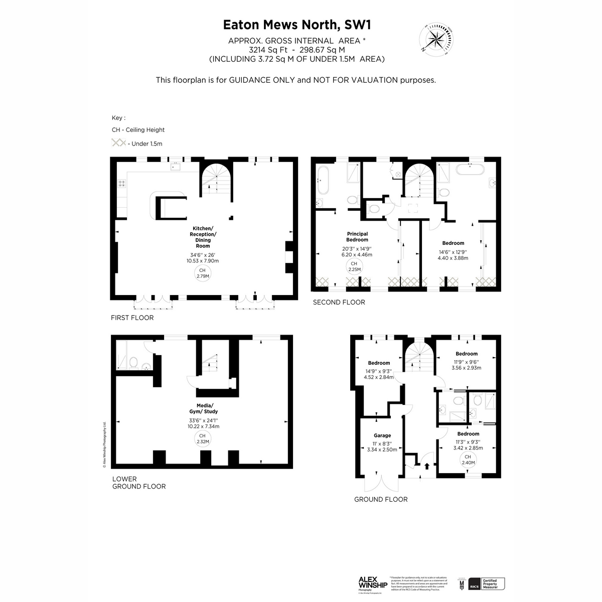 The layout centres on a substantial first-floor kitchen, reception and dining room extending across almost the full width of the house, with a recorded ceiling height of 2.79m. The lower ground floor is given over to a large media, gym or study space, providing separation from the main living accommodation. Upper floors provide the main sleeping accommodation, with the principal suite on the second floor and further rooms on the ground floor, alongside the practical advantage of internal access from the garage.