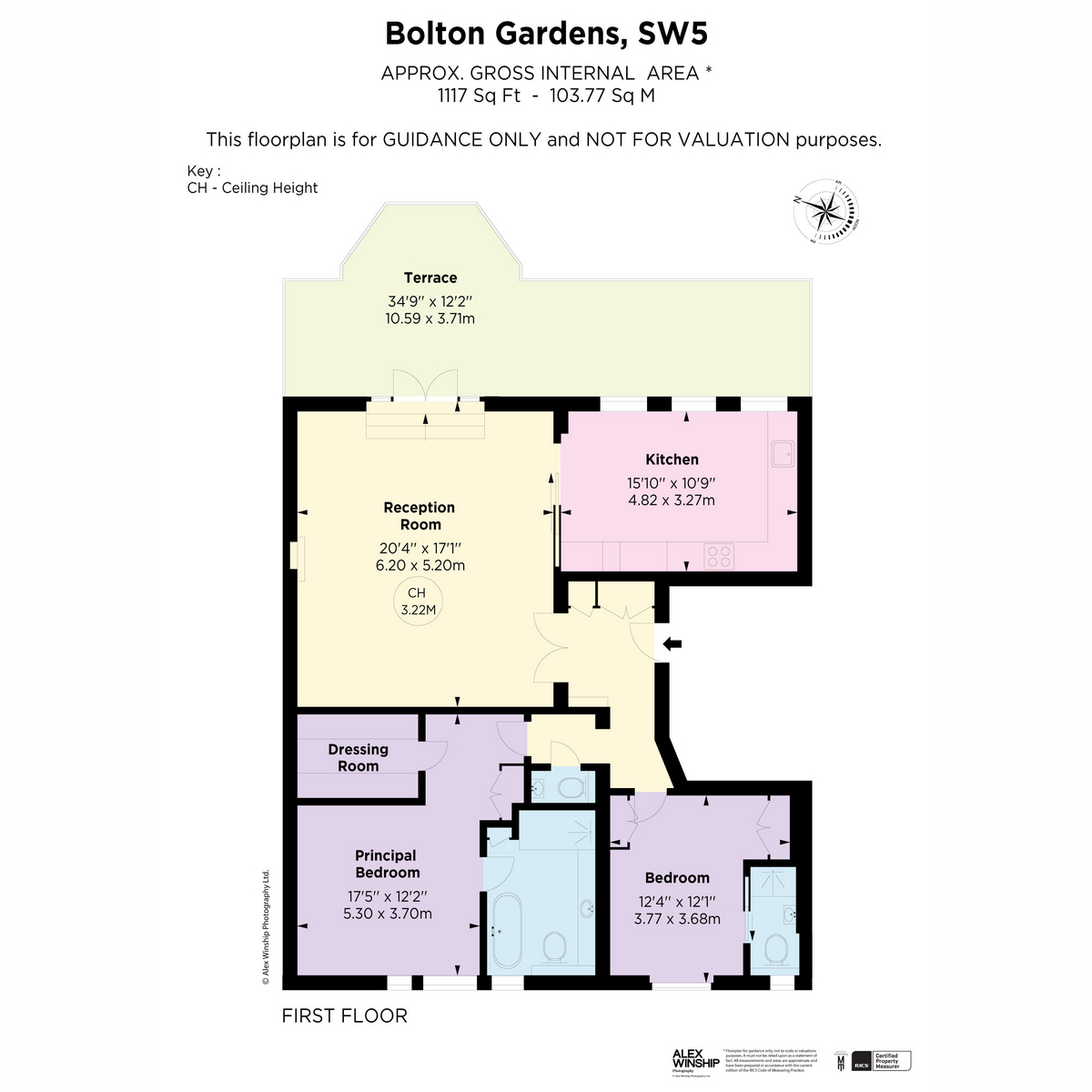 The apartment is arranged laterally across a single floor, following a conventional layout for a converted period building. Proportions reflect the building’s original design, with defined living space and natural light from large sash windows. The interior combines period structure with modern residential use, offering functional separation between living and private areas.