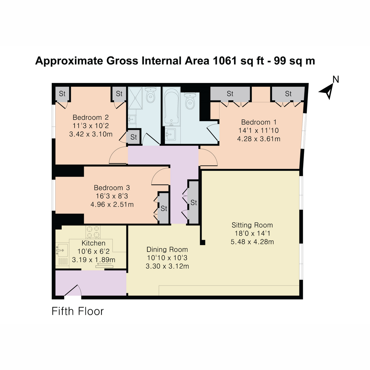 Spanning 1,061 sq ft, the property includes a spacious open-plan reception and dining area, a separate kitchen, and three double bedrooms. The principal bedroom benefits from an en suite, while a family bathroom serves the remaining two bedrooms.